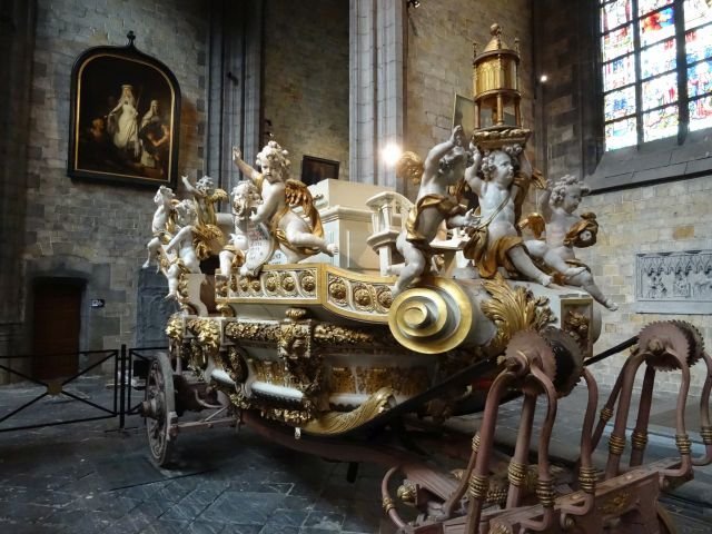 Each year as part of a festival, the shrine is placed on the car d'or, a gilded cart, and drawn by horses through the city streets